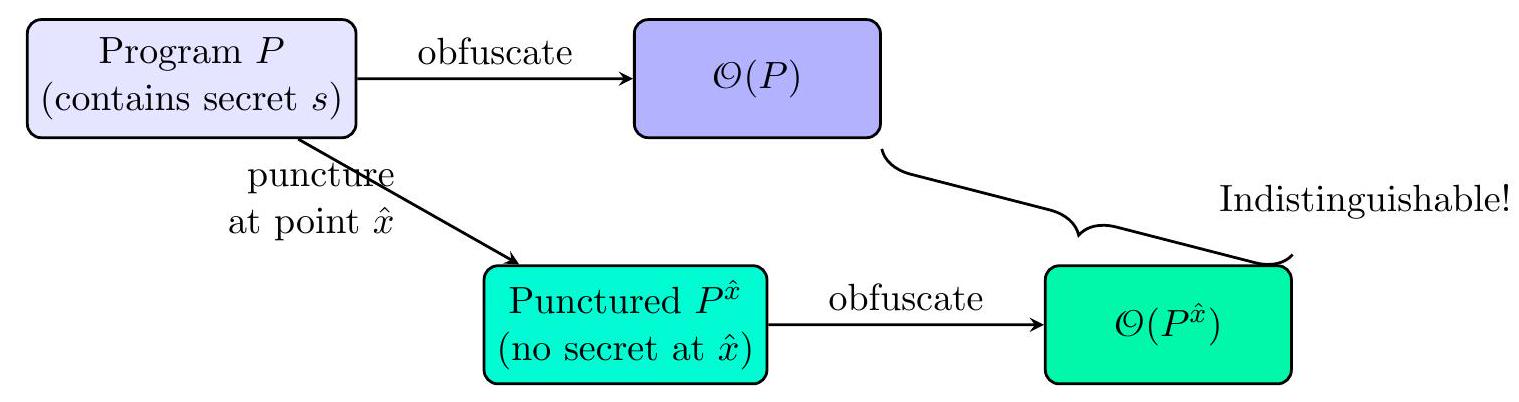The intuition is as follows: suppose you have a secret key or secret value \(s\) you want to hide in a program, but you can afford for the program to not use \(s\) on one specific input (to punt on that input). You can create two versions of the program: one full program \(P\) that uses \(s\) normally, and one punctured program \(P^{\hat{x}}\) that has \(s\) removed or scrambled in the code path for some particular input \(\hat{x}\). Both programs are functionally identical for all inputs except \(\hat{x}\) (where \(P^{\hat{x}}\) might output some dummy value instead of using \(s\) ). If chosen carefully \(\hat{x}\) can be a point that an adversary would need to query to learn the secret. Now,