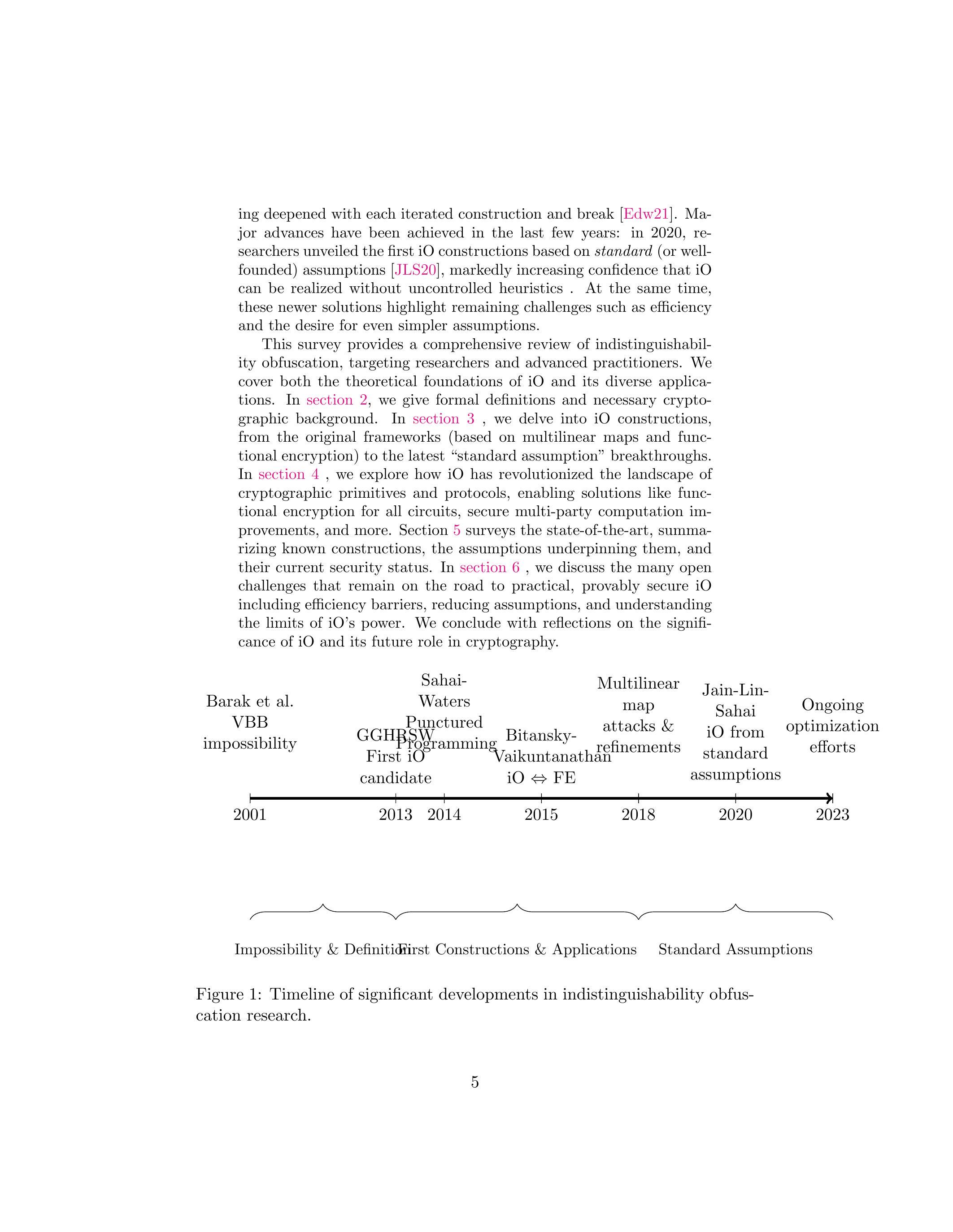 [^0]ing deepened with each iterated construction and break [Edw21]. Major advances have been achieved in the last few years: in 2020, researchers unveiled the first iO constructions based on standard (or wellfounded) assumptions [JLS20], markedly increasing confidence that iO can be realized without uncontrolled heuristics . At the same time, these newer solutions highlight remaining challenges such as efficiency and the desire for even simpler assumptions.