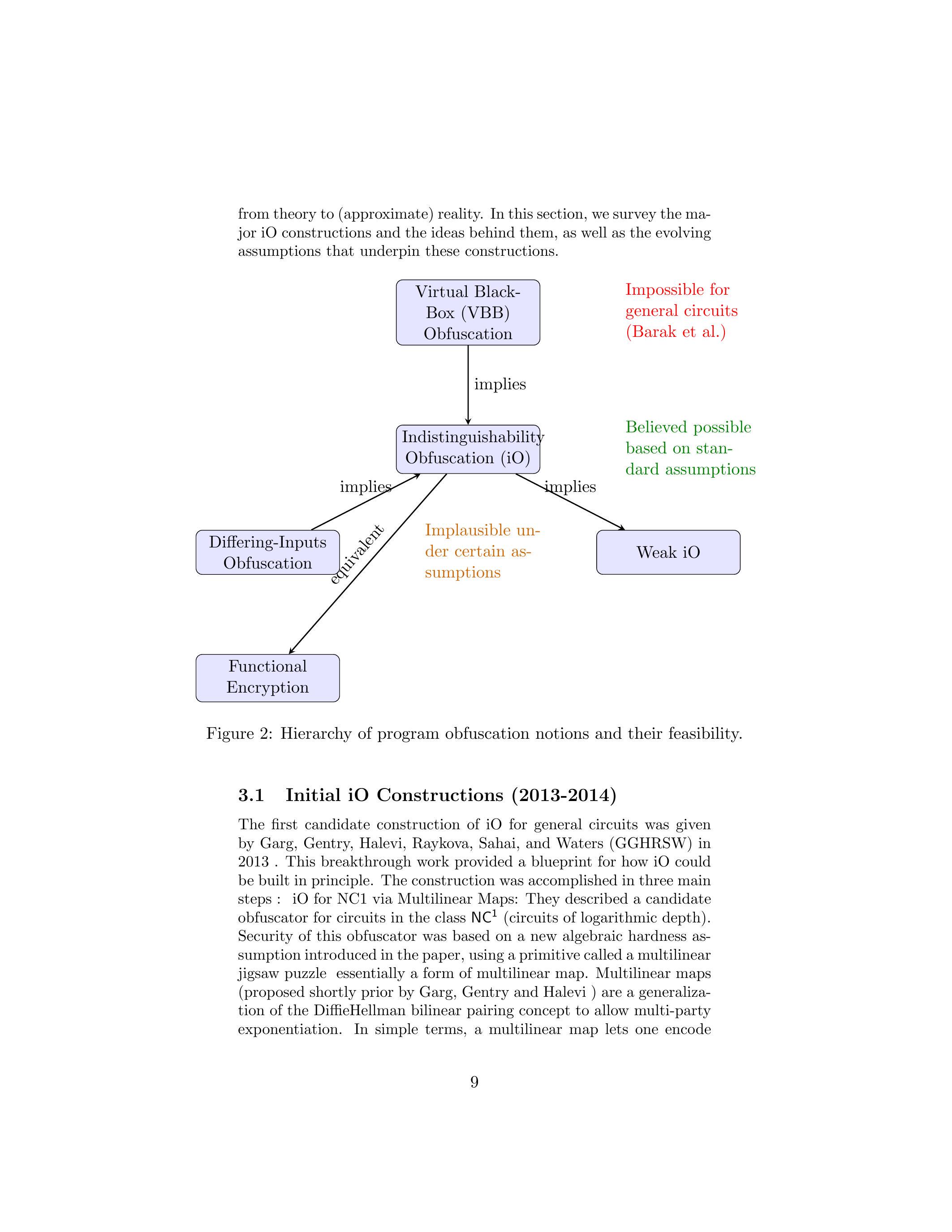 Several themes emerge from this exploration. First, iO serves as a powerful unifying framework disparate primitives and security notions can often be realized by constructing an appropriate program and obfuscating it, leveraging iOs guarantee to ensure security. This central hub quality of iO explains the tremendous excitement it has generated; it is no exaggeration to say that iO , if fully realized, would enable a form of cryptographic completeness, allowing us to bootstrap nearly any desired cryptographic functionality from basic components . Second, the path to realizing iO highlights the creative synthesis of techniques in cryptography: ideas from homomorphic encryption, multilinear maps, pseudorandom functions, and more all converge in service of obfuscation. The field has spurred new connections between cryptography and complexity theory, coding theory, and even software
