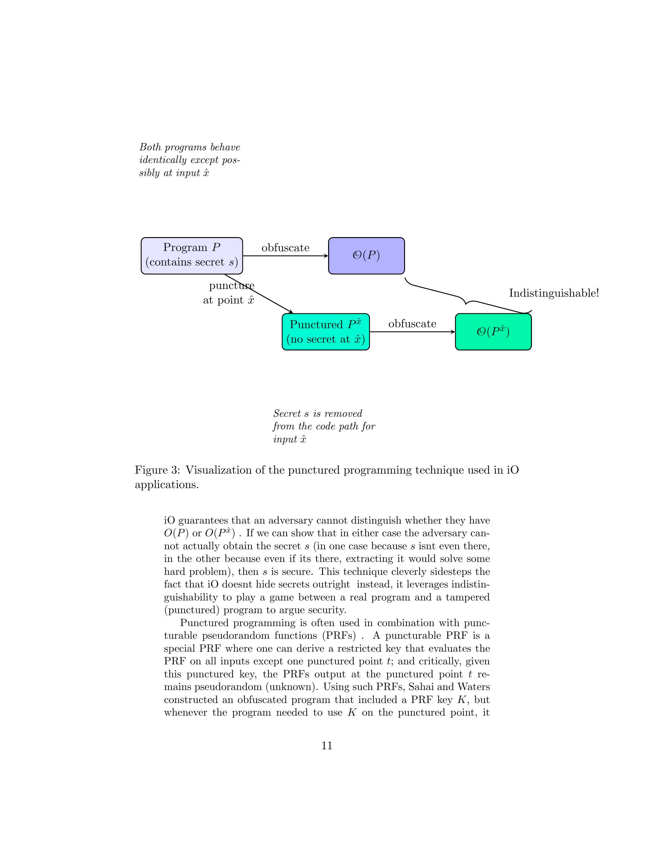 The intuition is as follows: suppose you have a secret key or secret value \(s\) you want to hide in a program, but you can afford for the program to not use \(s\) on one specific input (to punt on that input). You can create two versions of the program: one full program \(P\) that uses \(s\) normally, and one punctured program \(P^{\hat{x}}\) that has \(s\) removed or scrambled in the code path for some particular input \(\hat{x}\). Both programs are functionally identical for all inputs except \(\hat{x}\) (where \(P^{\hat{x}}\) might output some dummy value instead of using \(s\) ). If chosen carefully \(\hat{x}\) can be a point that an adversary would need to query to learn the secret. Now,