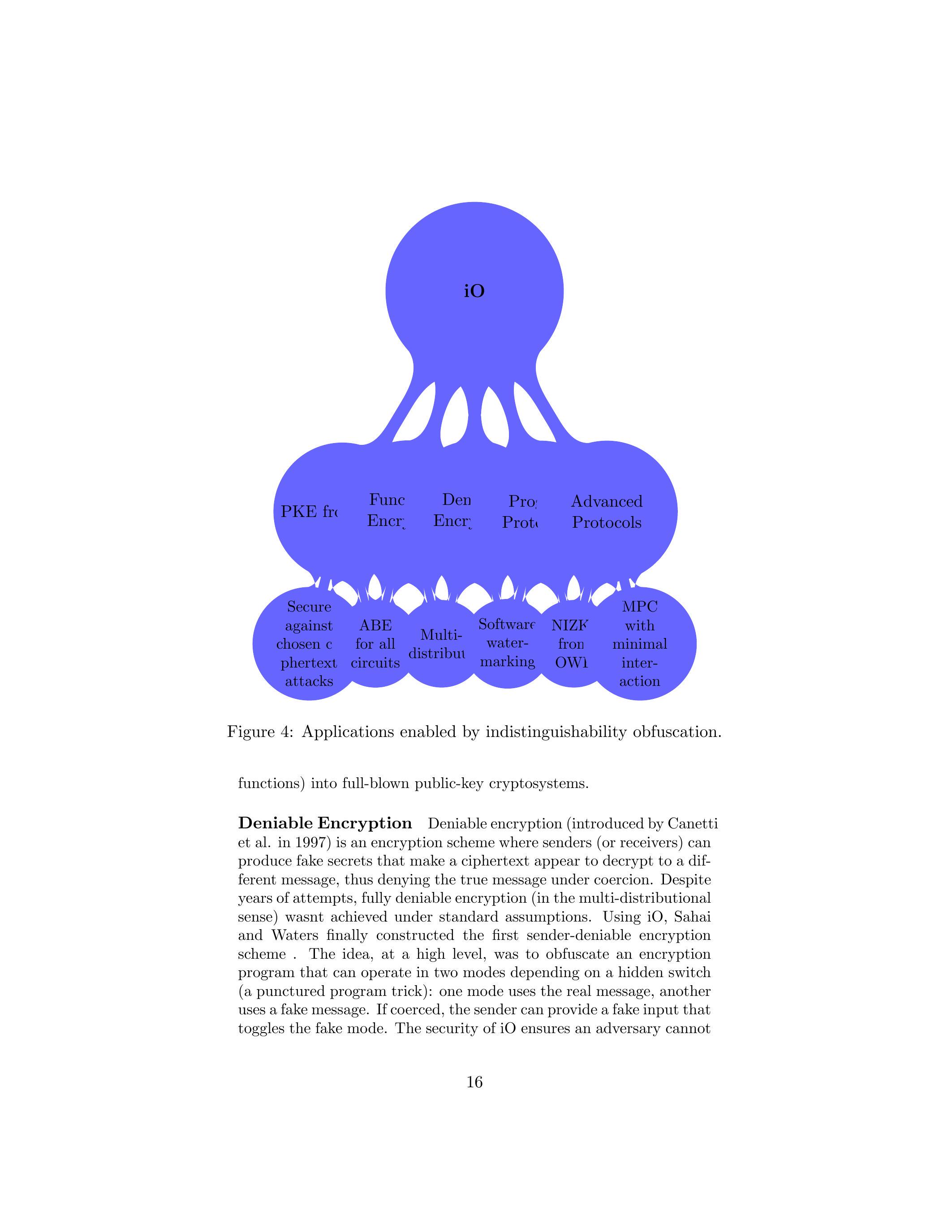 [SW14] (STOC 2014) demonstrated how to use iO to realize advanced cryptographic goals, settling open problems that had stood for years . In [SW14], they introduced the punctured programming technique and used iO to solve the long-standing problem of deniable encryption – an encryption scheme where a sender can produce a fake decryption key that makes a ciphertext appear as an encryption of a different message. The same work posited iO as a “central hub” for cryptography, showing that many disparate cryptographic primitives could be constructed through the lens of iO . The floodgates opened: countless cryptographic constructions (from standard public-key encryption to “first-of-their-kind” primitives) were realized by leveraging iO's unique capabilities. This explosion of results cemented iO's reputation as a “holy grail” of cryptography – a single primitive that, if achieved in full generality, would enable or simplify the construction of nearly everything else [BV15].